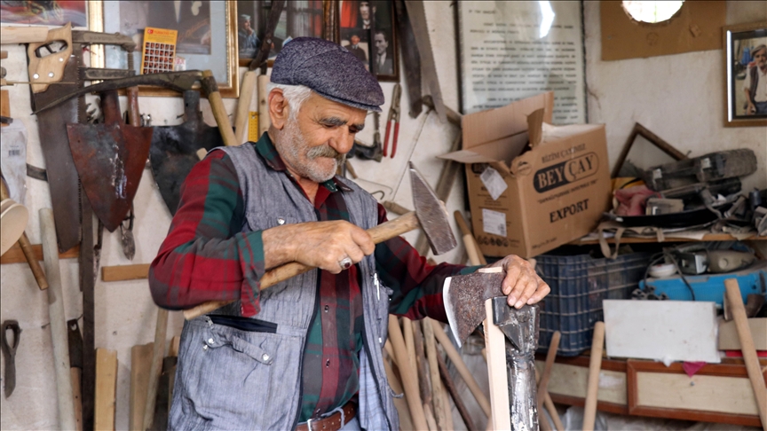 Amasya'nın Merzifon ilçesinde yaşayan 81 yaşındaki İsmet Bilgin, 70 yaşından sonra başladığı kazma, kürek ve balta gibi aletlere sap yapma işini sürdürüyor.